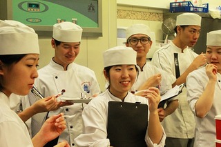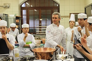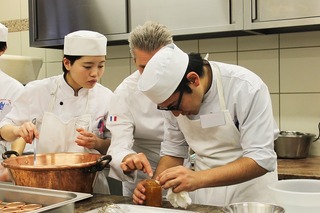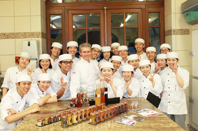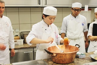 ナカムラさん「元々、コンフィチュールに興味があり、しかも毎朝食べているコンフィチュールという事で楽しみでした。実際に講習を受けてみて、ブルヌトン氏の作業は、一つ一つきれいで無駄がなく、すごくスムーズでした。コンフィチュールについて、ムニュ・スペシオ(卒業制作発表会)に向けて、アドバイスを聞き、すごくためになりました。」