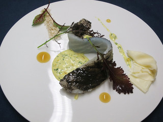 塩水に漬けた鱈の表面に黒ゴマのペーストを塗り、生のまま提供します。ライオール産のトムフレッシュチーズをお湯で柔らかくして薄く伸ばしたものを付け合わせにしています。