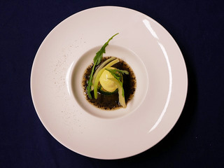 巻き上げた料理です。ソースはトリュフで作ったドレッシングと、鱈の料理同様に半熟卵を使いナヴェットオイルで乳化させたものにゼラチンを加えたソースです。