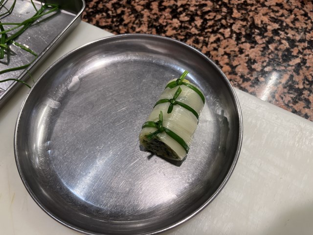 次にポロねぎのカネロニを作ります。ポロねぎの外側の部分を鶏の出し汁の中で火を通し、ラップの上にきれいに並べます。そこに薄切りにして柔らかくなるまで火を通した玉ねぎとポロねぎに、香草のみじん切りを混ぜたものを置いてラップで巻きます。1人前に切り分けたら軽くゆでたシブレットでポロねぎを縛って形を整えます。