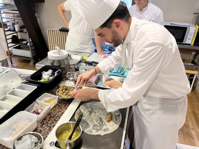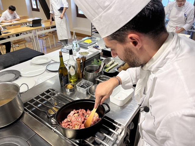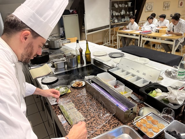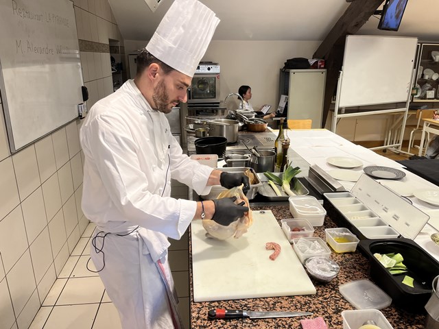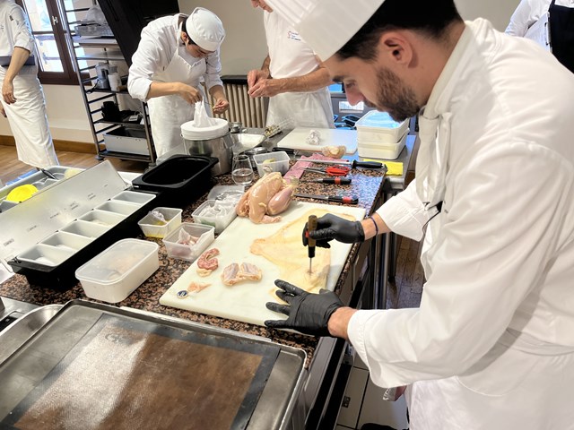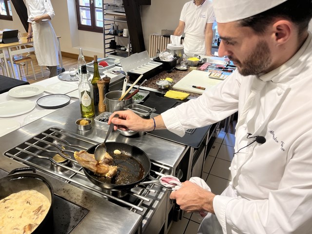 今期最後の調理外来講習は、リヨンから南に30kmほど下りたところにある、ヴィエンヌという町のレストラン『ラ・ピラミッド』でスー・シェフを勤めているアレクサンドル・ヴュイラン氏にお越しいただきました。ヴュイラン氏は今年の4月に行われた『ブレス鶏のクリームソース世界選手権』で見事優勝された実力者です。今回の講習では、その大会で提供された世界一のメニューを作っていただきました。