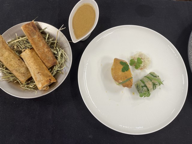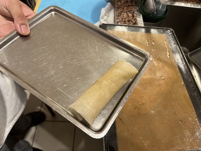 次に、もも肉をにんにくとタイム、ゆずの皮で香りをつけてコンフィにし、1cm角に切りそろえたものと、みじん切りにした玉ねぎの炒めたもの、レモンの皮とジュース、にんにくのみじん切り、シブレット、鶏の心臓とレバーを角切りにしたものを混ぜ合わせて味を調え、パート・ブリックで巻いてフライパンで焼きます。