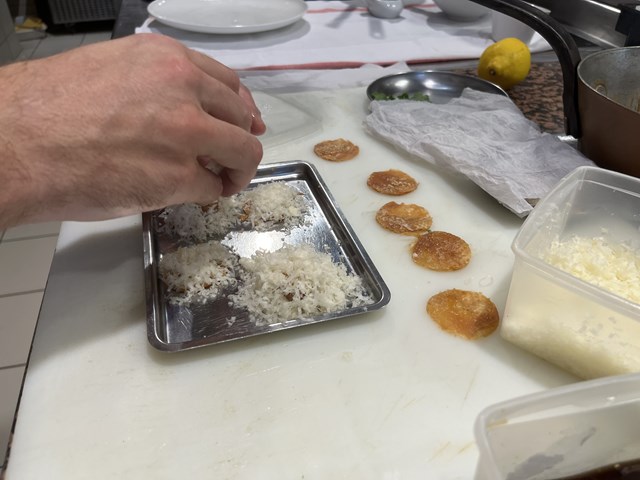 最後はうずらの卵を使ったつけ合わせです。うずらの卵の卵黄をポン酢に漬け込みます。焼きあがった鶏の皮を丸くくり抜き、上にすりおろしたコンテチーズを乗せ、さらにその上に味が染み込んだ卵黄を乗せ、チーズをおろしかけます。