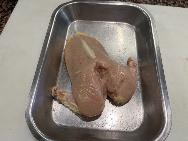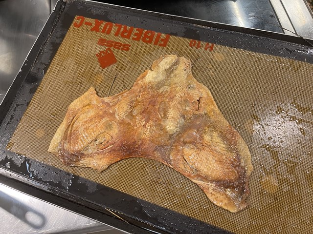 まずは鶏の下処理からです。頭、首づる、足先を落とし、内臓をまとめて引き抜きます。次に全身を覆っている皮を、首からもも肉にかけてきれいに1枚になるように取り除きます。取り除いた皮は、千枚通しのような包丁を使って表面を細かく突き刺し、鉄板で挟んで170℃のオーブンでパリっとなるまで焼きます。もも肉はそれぞれ切り落とし、胸肉はコッフルという形にします。