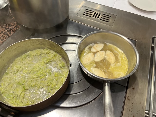 次につけ合わせです。根セロリは木の葉型に抜いて鶏の出し汁とバターでグラッセというつや煮にします。