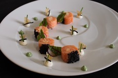 サーモンを低温調理し、西洋わさびのクリームとハーブのマヨネーズを取り合わせた前菜です。パーツひとつひとつの細かい作業がとても際立つ一品です。