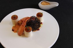 オマールをメインにした一品です。オマールの身はしっとりと火が通っています。付け合わせには根セロリのリゾットやシードル酢のジュレなどが添えられており、イチゴとトマトのソースとソース・ショロン(温製マヨネーズ)でさっぱりと頂ける料理になっています。
