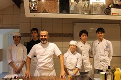 アシスタントを務めた学生は、フランス料理研究課程の新井良安君(左端)、吉満夏海さん(右から三番目)、吉村一平君(右から二番目)、高野敦史君(右端)でした。