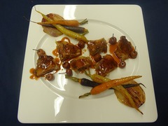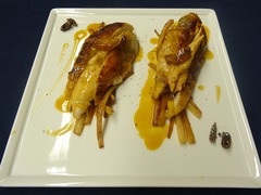 1品目同様にほろほろ鶏の胸肉はしっとりと火が通されています。付け合せには棒状に切り、フライパンで蒸し焼きにしたサルシフィ(西洋牛蒡)を添えます。皿の隅に火を通した際に香りを移す目的で加えられた香辛料、カルダモンノワール(黒ショウズク)を飾っています。