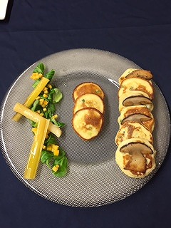 湯でて潰したじゃがいもに、小麦粉と卵を混ぜ合わせてクレープ生地の様なものを作ります。片面を焼いた後セップ茸をのせ、裏返してさらに焼きます。周りにはマーシュというサラダ用の葉を置き、角切りにしたかぼちゃのピクルス、燻製の香りをつけたポロねぎを添えます。