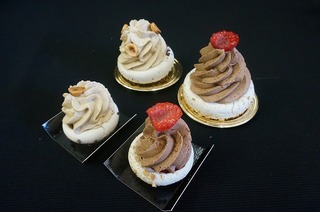 サクサクしたメレンゲにカシスのコンフィチュールとヘーゼルナッツのクリームをたっぷり絞った一品と、フランボワーズのクーリとチョコレートのクリームを合わせた2品を作成していただきました。