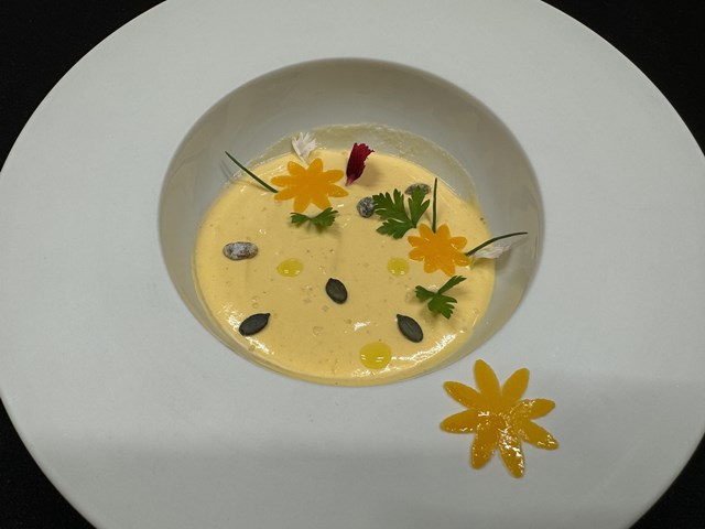 フォワ・グラのムースを冷やしておいたお皿にかぼちゃの種のプラリネ、クレモンティーヌのジュレを絞り、上からバターナッツのムースをかけます。仕上げに花柄のバターナッツ、かぼちゃの種、レモン風味のオリーブオイル、お花やハーブを飾って完成です。