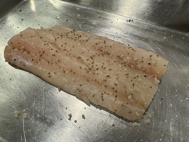 2品目はスズキとカリフラワーを使った魚料理です。スズキはフィレにおろし、ゲランドの塩とフヌイユの種で5分間マリネします。