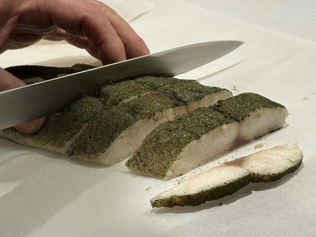その後、塩を洗い流して水気を切ってラップをし、70℃のオーブンで芯温が42℃になるまで火を通します。その後、表面に青のりを振りかけて切り分けます。