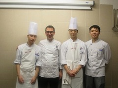 シェフを囲んで、助手を務めた幸田 颯君(左)と田中 一樹君(右から2番目)、研修生の栃澤 康平君(右)
