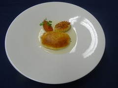 棒状に切られたサーモンに、サンドル(川にいるスズキ科の魚)で作った魚のムースを塗り、白ワイン、魚の出し汁を使って火通しされた一皿。火通しは非常に丁寧で繊細。ムースに焼き色が付くように途中で温度を変えています。