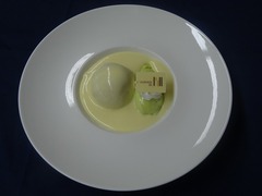 シロップで柔らかく煮た種付きの桃に、シャンパーニュと卵黄などで作ったサバイヨンをたっぷりとかけ、ピスターシュのアイスクリームを添えます。