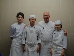 シェフを囲んで、研修生の保坂 周君(右)、助手を務めた関 城一郎君(右から2人目)と岡本 真緒さん(左)