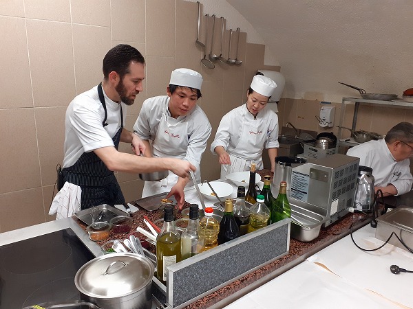 今回の外来講師は、フランス校から車で1時間30分程、サヴォワ地方ブールジェ湖近くの2つ星レストラン「レ・モレニエール」からシェフのミカエル・アルヌー氏にお越し頂きました。