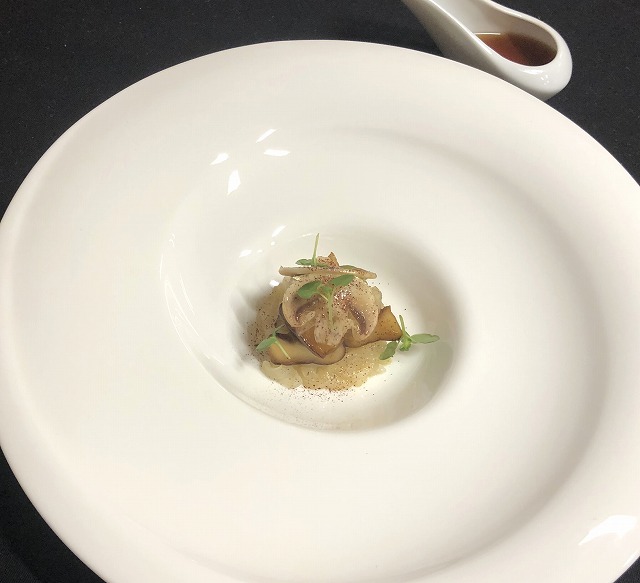 玉ねぎを甘くなるように炒め、そこに未成熟のブドウジュースを加えたコンポート状のものを作ります。また、大根を同じブドウジュースと砂糖とともにピクルスにします。肉厚の椎茸をバターでソテーし、旨味を引き出しています。マッシュルームは逆に生のまま薄切りにし、香りを重視しています。ソースは野菜で取ったブイヨンに白しょうゆを加えたもの、ブドウジュースと砂糖を煮詰めて作った甘酸っぱいキャラメルソースを使っています。旨味、香り、酸味、甘味のバランスが取れた一皿です。