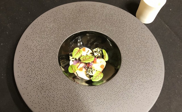 帆立貝は香りよくオリーブ油でソテーします。香味野菜とショウガを炒め、ダシ、コブミカンの葉を加え味と香りを引き出したものに生クリームを加えてソースを作ります。牛乳と海藻を混ぜて沸かしたものにパールアガーを加えて固め、サイコロ大に切りノリをまぶします。大根2種は3㎜の角切りにし塩湯がき、コールラビは牛乳、生クリームで炊いてピュレにしました。帆立貝・ノリなどを使った海の香りを、コールラビのピュレやコブミカンの香りのソースがまとめている一皿です。