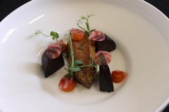 1品目はフォワ・グラを使った1品です。ソテしたフォワ・グラと生のビーツ、そして長時間火を通したビーツが添えられています。アクセントとしてカボチャのピュレも添えられています。