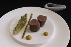 2品目は鹿をメインにした1品です。ジビエと呼ばれる分類の中にある鹿は、この時期しか食べられません。付け合わせにはアンディーブのソテ、マスタードのクルート(パン粉とバターを合わせた生地)、栗とマンダリンのピュレが添えられています。ソースは、フォン・ド・ヴォを煮詰めたところにカシスのピュレと熟成させたらっきょうのペースト(日本産)を合わせたものです。
