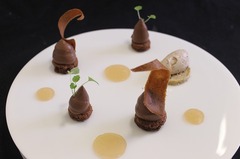 3品目はデセールです。チョコレートとコーヒーを取り合わせた1品です。コーヒーのジュレ、チョコレートクリーム、ココアのビスキュイ、カカオのアイスクリームが添えられています。