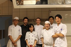 講習のアシスタントを務めたのは、フランス料理研究課程の福本将之君(右端)、砂川拓郎君(右から2番目)、佐伯黎司君(右から3番目)、岡本麻希さん(左から3番目)、LOW YONG XIN君(左端)でした。