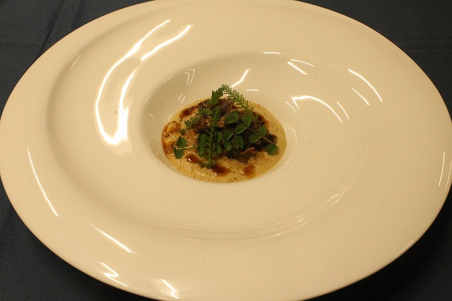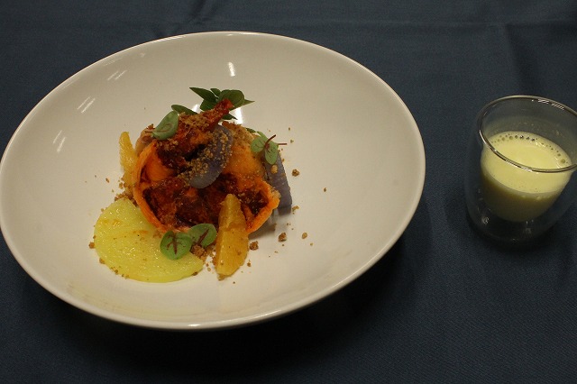 ソースはオリーブ油でエシャロット、サツマイモを炒めたところに日本の焼き牡蠣風味の出汁とターメリック、生クリームを加えて軽く煮詰めたソースを添えています。