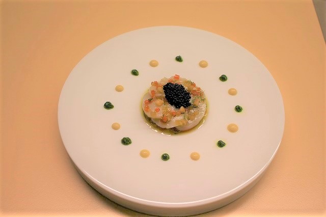 セロリ、ニンジン、エシャロットを煮詰めたものでホタテの薄切りを上下に挟むようにデコレーションしたもの。野菜を煮詰めるためにはゆっくりと時間をかけます。上部をキャビアで飾り、お皿はエストランゴンソースとマヨネーズで模様付けをしました。やわらかいホタテと煮詰めた野菜に薄っすら残った歯ごたえを一緒に楽しみます。