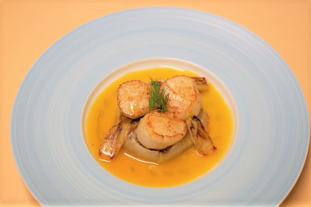 アンディーヴをオレンジの果汁とバターで煮込み、香りを付けます。その後バターで色付けしたものを型に入れ、ホタテのポワレを上に飾り、煮込み用に使用したオレンジソースをかけたものです。オレンジの香りが食欲をそそります。