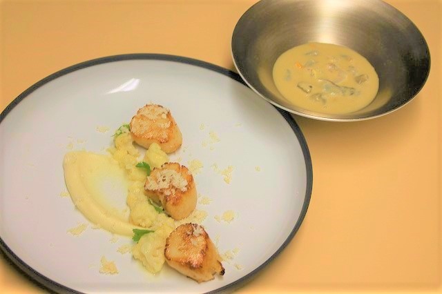こちらも今の季節の野菜である、カリフラワーのピューレ、火を通したもの、生をおろしたものと、フライパンで焼き目を付けたホタテを共に載せました。付け合わせはホタテ貝のヒモから取った出汁とマテ貝、コック(ザル貝)、カキで作った豪華なソースです。