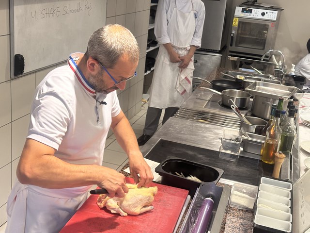 今回の講習では、ブレス産のプーラルド(雌鶏)を使って、前菜とメインの2品を作っていただきました。