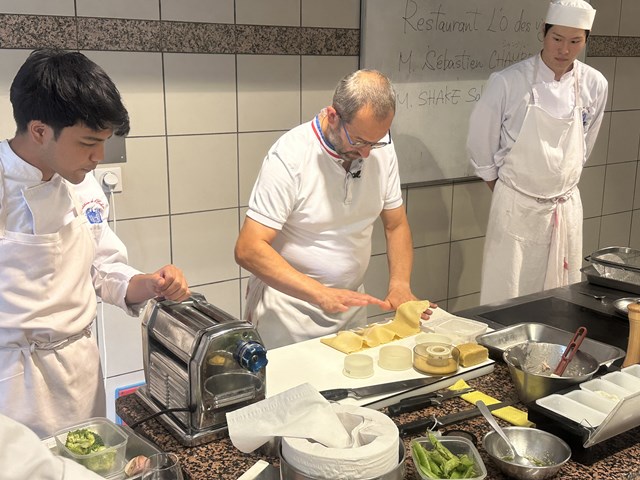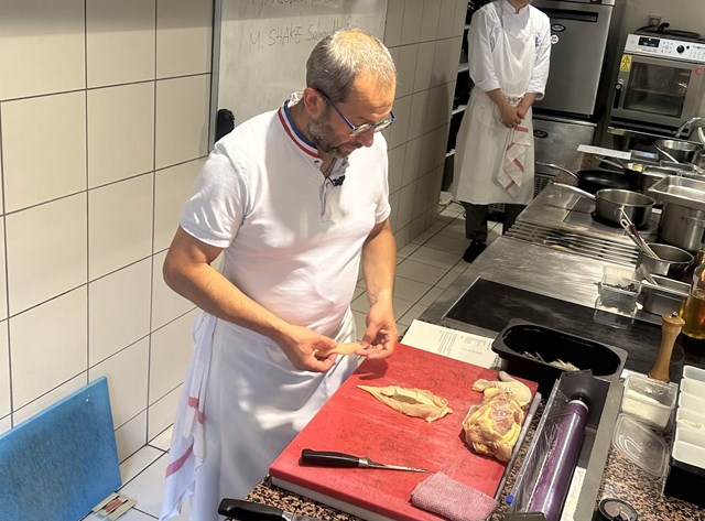 フランス校では、既にナレ先生から鶏の捌き方は習っていますが、いつもと違う捌き方や、レストランならではの下処理等を教えていただき、研究生はしっかりとその方法を目に焼き付けていました。