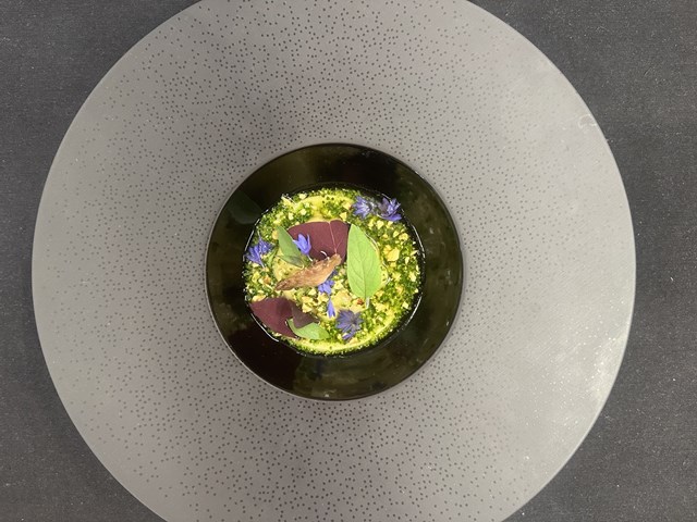 『Raviole de cuisse et abatis, vinaigrette brocolis noisette』