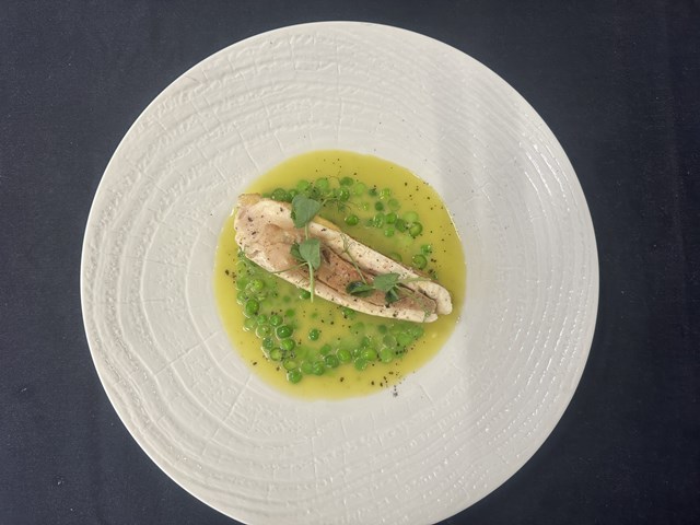 さやから外したグリンピースをさっと茹でてから薄皮を剥きます。さやは捨てずにジューサーにかけてソースに使用します。白ワインとエシャロットを煮詰めて、バターを加えてソーのベースを作ります。仕上げにグリンピースのさやのジュースを加えます。一般的には、鶏肉の料理には鶏の出し汁を使ったソースをよく合わせますが、シェフのアイデアでソースにグリンピースの青っぽさを加えることで変化を付けます。胸肉の皮目をさっと焼き、ソースの中で温め直したグリンピースを盛りつけ、ソースをたっぷりとかけて完成です。