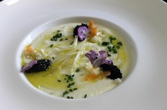 一品目はカリフラワーのヴルーテ。この日のカリフラワーは鮮度が良かったので、出し汁などを使わずに、カリフラワーと生クリームだけでスープを仕上げ、ニシンの卵や生のカリフラワーなどを添えて仕上げました。