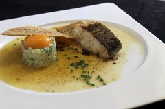 付け合わせは、タラのペースト(玉ねぎ、にんにく、ジャガイモ、オリーヴ油、タラ、パセリ)です。そのペーストの上には、90℃の油の中で火を通した卵黄がのっています。