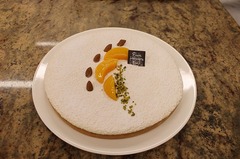 タルト生地を焼き、その中に、黄桃をくし切りにしてコンポートにしたものを敷き詰め、更にマジパンといわれる、アーモンドをペースト状にしたものをベースに作成したムースで覆い、仕上げました。