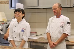 講習の助手を務めたのは、製菓研究課程の萩原 誠也君と山路 百果さん。とても早口なシェフの言葉を頑張って聞き取り、緊張しつつもサポートしてくれました。