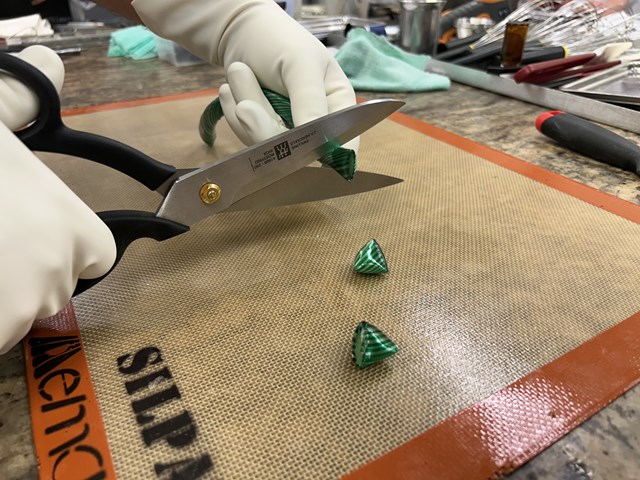リボン状にし、飴を包んだら少しずつ伸ばし棒状にして手でカットしていきます。見ていると簡単そうですが、冷えていくとカットできずに割れてしまうところが飴の難しい所です。