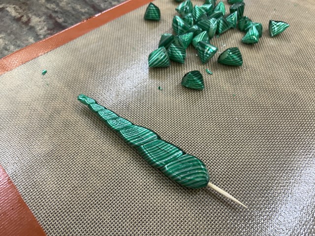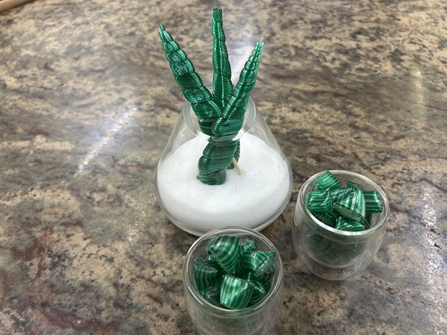 ストライプの四面体の飴のことをベルランゴと言います。南仏のカルパントラという街の発祥です 、フリュイ・コンフィに使ったシロップを再利用して作られたと言われています。砂糖と水を約162℃まで煮詰め、2色の飴を作り、satiner(サティネ)という作業をしていきます。サティネとは、温度が下がってきた飴を引いていき、空気が入り光沢のある飴にすることを言います。この作業を行うことで食べた時の食感が軽くなります。