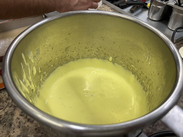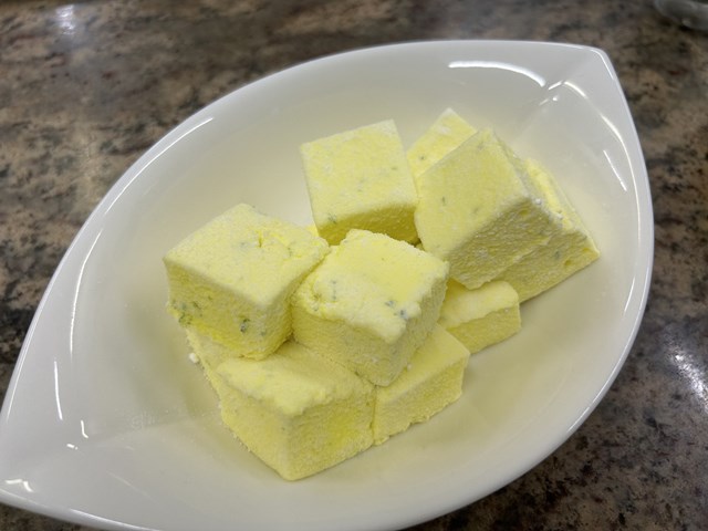一般的なギモーブは卵白にシロップ、ゼラチンを加え泡立てたメレンゲを使用しますが、サラディノ氏は卵白を使用せず、代わりにトリモリン(転化糖)を使用します。実際に試食させていただくと、口溶けが良く、さらにミントの香りを加えることによってより爽やかな仕上がりになっていました!