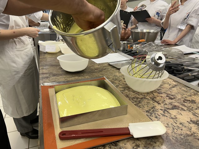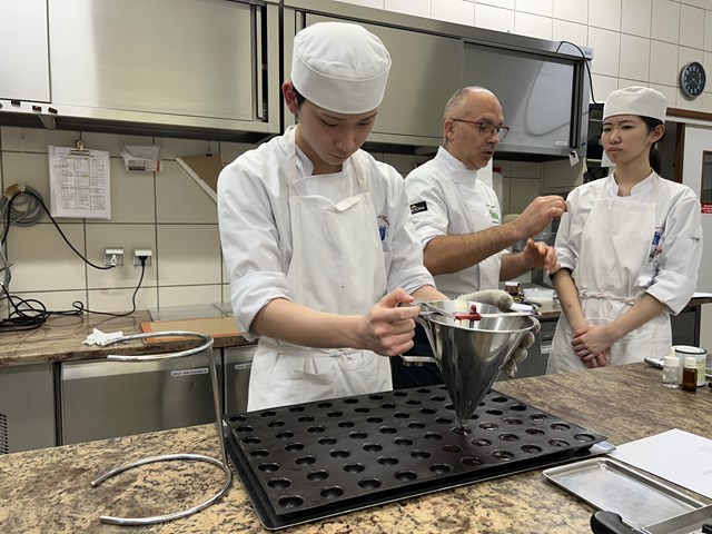 『今回のデモンストレーションでは1時間半という短い時間の中で5種類作成していただきました。講習中のシェフは洗い物を増やさないためにできるだけ器具を使い回したり常に台上を綺麗に保つなど、基本的なことを徹底されていました。私自身、実習中にはできていないことを当たり前のように、また、とてもスピーディで無駄なく作業を進めておられた姿がとても印象的でした。こうした一つ一つの細かな心掛けが、作業全体のスムーズさに直結するのだと改めて感じました。学校での実習も残すところムニュ・スペシャルのみとなりましたが今回のデモンストレーションで学んだことを活かし、これまで以上に作業の進め方や周囲に気を配りながら取り組みたいと思います。』