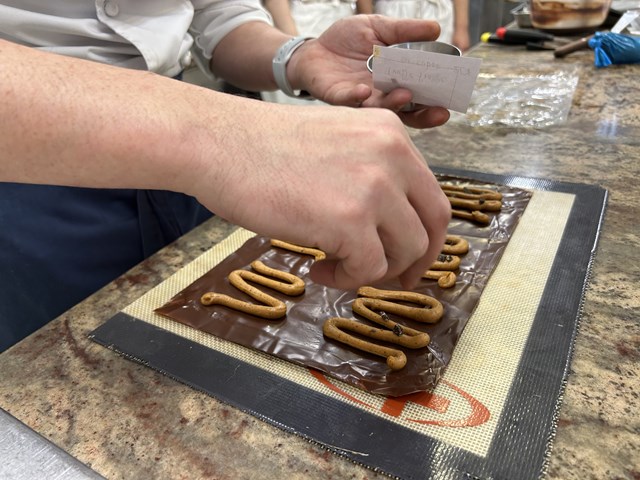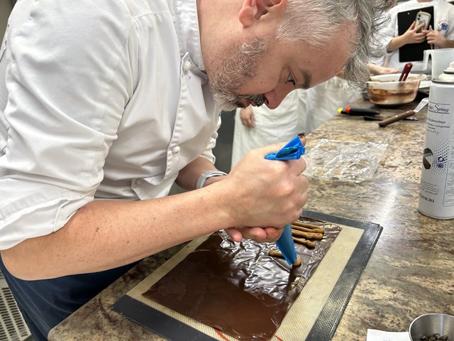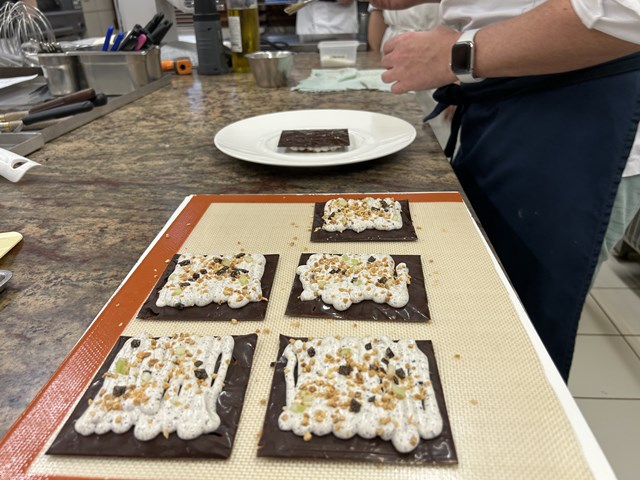 アシスタントを務めた研究生もシェフと同じように仕上げていきます。ショコラは薄くないと味が重たくなってしまう為、素早く、できるだけ薄く伸ばしていきます。