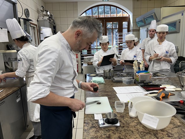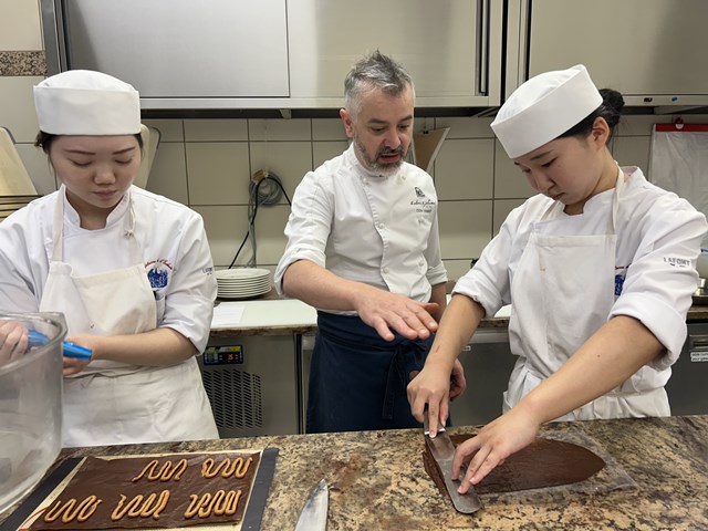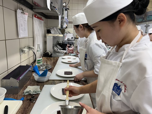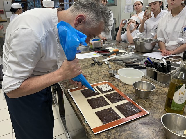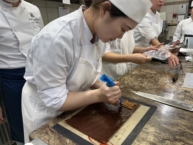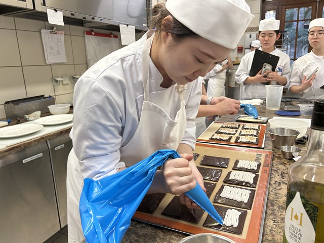 『アシェットデセールの外来講習でアシスタントを務めさせていただいたことは今回が最初で最後の貴重な経験でした。『デセール・ショコラ・トリュフ』という名前の通り、普段の実習では体験できないほどの量のトリュフを扱っており、その香りに圧倒されました。ショコラを伸ばす作業やクリームの絞りなどシェフの横で直接ご指導いただきアシェットデセールならではの作業の進め方感じることができました。現在行っている実習でもアシェットデセールを提供しているため、残りわずかではありますが今回学んだスピード感や作業の段取りを意識しながら実習に取り組みたいと思います。』