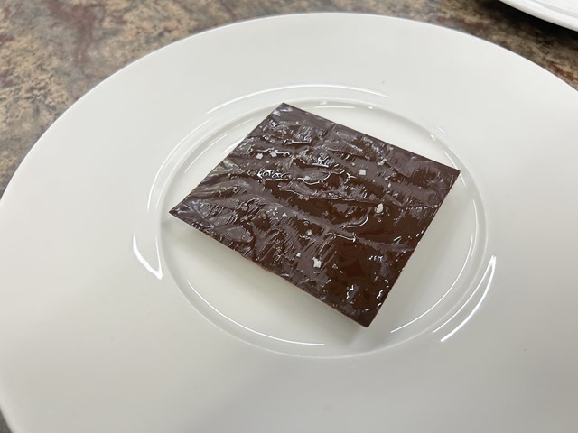 お皿に濃厚なショコラのソースを流し、組み上げたショコラをひっくり返します。表面にオリーブオイルと粗塩を散らせば完成です。トリュフの香りが口の中いっぱいに広がり、ショコラにアクセントとしての塩が良く合います。