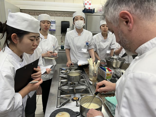 『作業の美しさや、これまでの経験があるからこそ可能な『見た目で判断する力』、そして同じ作業を繰り返しても毎回同じように出来上がる正確さに強く感銘を受けました。将来レストランで働きたいと考えている私にとって、段取りや手際の良さを間近で見ることができたことは非常に学びが多く、貴重な経験になりました。また、 "レストラン業界で成長したい人へのアドバイスは何ですか"と質問した際に笑顔でいることが大切だと教えていただきました。これは以前から先生にも言われていたことですが、フランスでは元気がなかったり不機嫌そうに見えると教えてあげようという気持ちが生まれにくいそうです。反対に、笑顔でいることで学びたいという意欲が伝わり教えてあげたいという気持ちになるのだと知りました。スタージュ開始まで、あと1か月弱。今回の学びを大切にしながら、前向きな姿勢を忘れずできる限り多くのことを吸収していきたいと思います。』