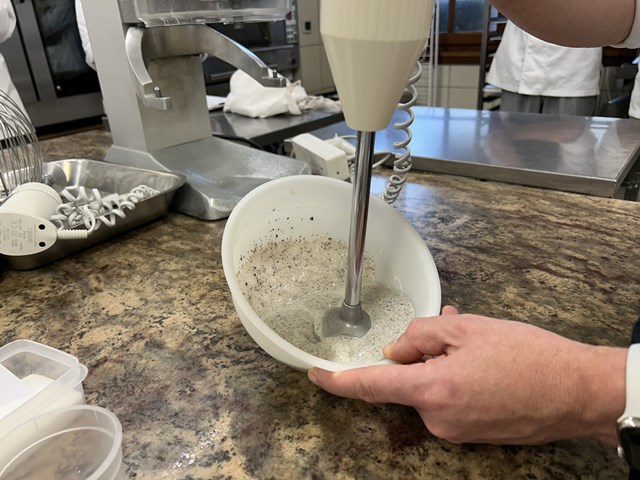 牛乳、卵黄、砂糖を82~85℃まで炊くクレーム・アングレーズというソースを作りますが、温度計を使わずに確認する方法を教えていただきました。ゆっくりと火を通し濃厚なソースが出来上がればショコラと混ぜ合わせます。